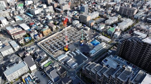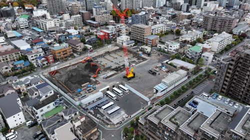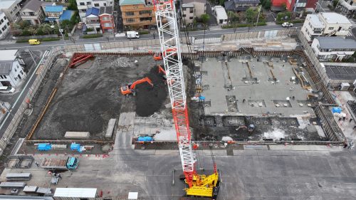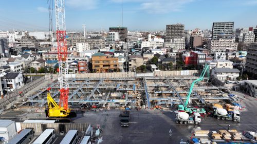 2026.01.27 新築工事 足立区立東渕江江小学校改築工事 ④根切工事完了・基礎躯体工事 足立区立東渕江小学校の校舎基礎工事の基礎をつくるための地盤を掘削する根切工事が終了し、現在基礎躯体工事を行っています。 根切工事空撮 根切工事実施状況 基礎躯体工事空撮 基礎躯体実施状況