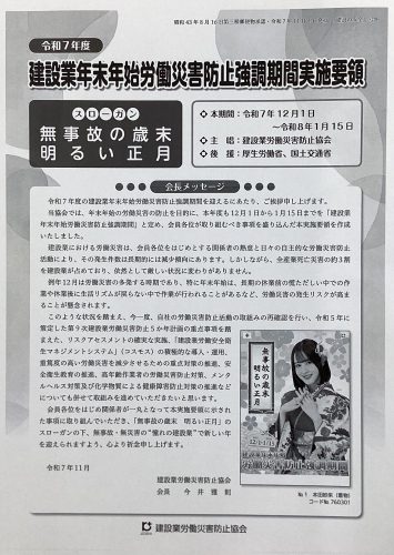 2025.12.05 安全 年末年始労働災害防止強調期間に社長安全パトロール実施 建設業年末年始労働災害防止強調期間(令和7年12月1日~令和8年1月15日)に、株式会社三浦工務店では社長による安全衛生パトロールを実施いたしました。 年末年始労働災害防止強調期間の主旨を踏まえ、「無事故の歳末 明るい正月」をスローガンに、改めて安全意識の徹底に取り組んでいます。 リスクアセスメントの確実な実施、重篤度の高い労働災害を減少させるための重点対策の推進など安全管理を徹底し、無事故・無災害で新年を迎えられるよう努めてまいります。